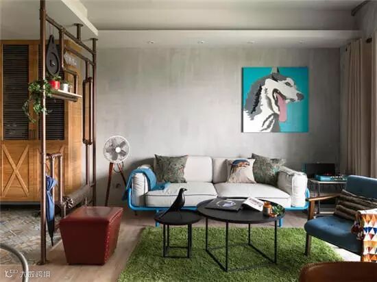 厨房、餐厅之后则是小小的客厅,混凝土风的裸露墙面混搭宜家的质感沙发,营造一个三口之家的休闲娱乐空间。