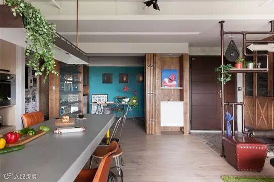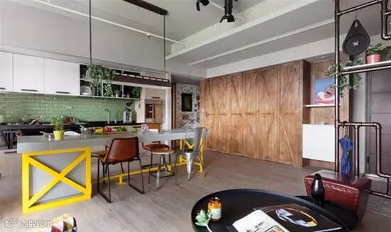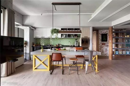 家里少不了一些清新的绿氧植物,装点出明媚的生机景象,桌岛下面各式工业感十足的座椅,局部的生砖墙面以及金属板墙面等,处处散发着设计感。