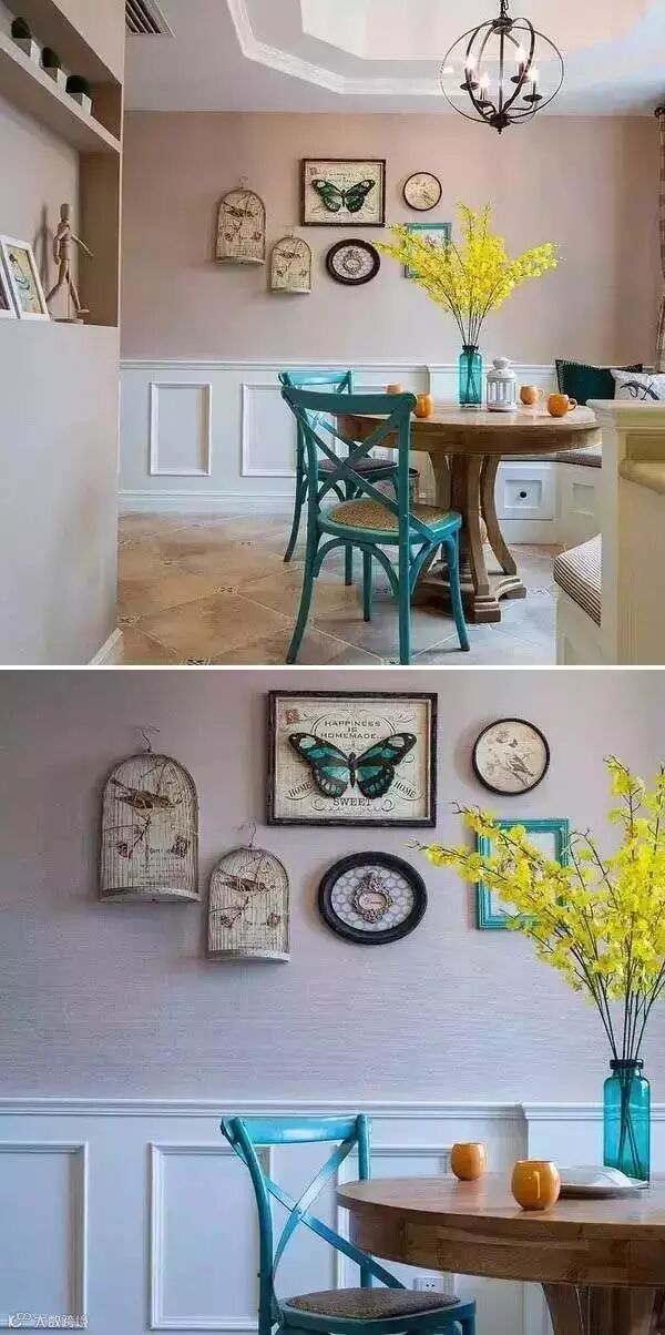 餐厅,清新明艳亮丽的餐厅搭配,卡座式的设计浪漫又实用,白色的护墙板、米色系壁纸、搭配蓝色餐椅,一股清新风扑面而来~