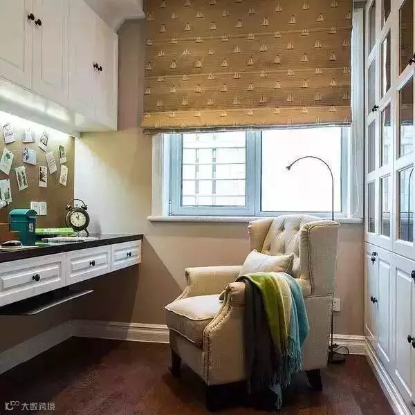 书房,10平米左右的空间,业主是想给改成工作间+休闲区,为了配合房间的尺寸,所有的柜子都是定制的,清空是业主要的一水的白色系。空间足够,所以放了台灯、和边椅,晚上只开一个小灯、安静的看书、思考,也不错哦~