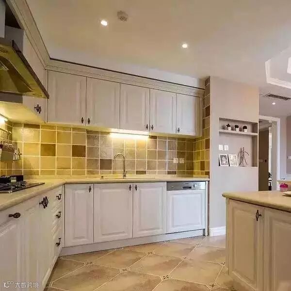 开放式厨房,地面仿古拼花砖效果很好,但用在厨房打扫卫生上还是有些困难,好在业主做饭少,白色的橱柜,要的就是颜值,厨房300*300的彩色小墙砖,色调温和,用在厨房特别合适~
