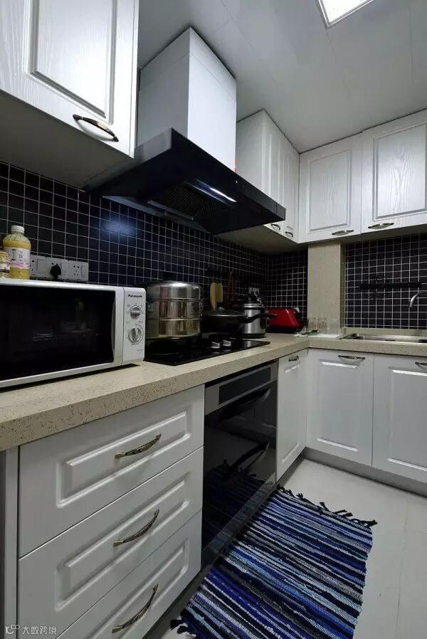 厨房,黑白配的效果,干净明亮,面积不大,所以橱柜都是满柜,把零零碎碎的东西统统装起来~