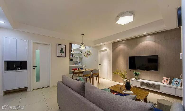大伙看客厅的吊顶,因为房了层高不高,再加上不规则,所以做了一个不规则的藻井式吊顶,加上筒灯,效果出乎意料的好;客厅的主灯也是最简单的LED灯,搭配简单的吊顶,和华丽的吊灯相比,一点也不是逊色。
