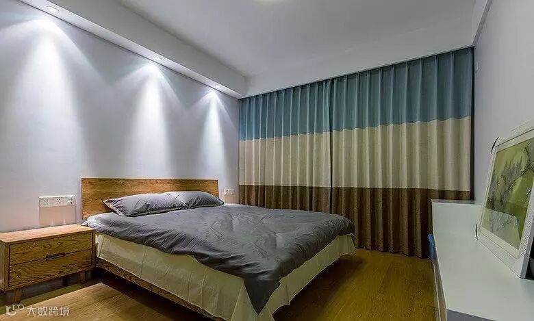 拉上窗帘后的卧室,原木色桌板加床头柜,棉麻材质的床上用品,透着自然纯朴的气息。因为实在色彩太素了,选窗帘时,选了这种三色拼接效果的,业主当初不满意,卧室搭配完却特别喜欢~