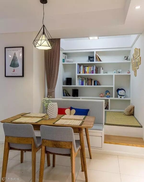 小餐厅,卡座式餐桌,节省了很多空间。原本餐厅的面积隔出榻榻米式的书房,平时是休闲区,也可以当作临时的卧室,功能多样,业主特别满意这块儿的设计。