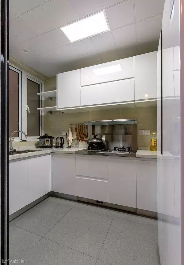 厨房,白色烤漆橱柜、搭配石英石台面、米色墙砖,自带净化的感觉,干净明亮、功能多样;就是以后打扫卫生肯定会费些时间,业主估计是处女座吧~