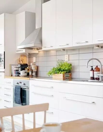 厨房的整体橱柜同样采用纯白系列,银色的把手和操作台面是很不错的点缀,带来了优雅感。一字型的样式能很好的将墙面闲置空间占据,同时足够量的收纳会是厨房的最佳帮手。