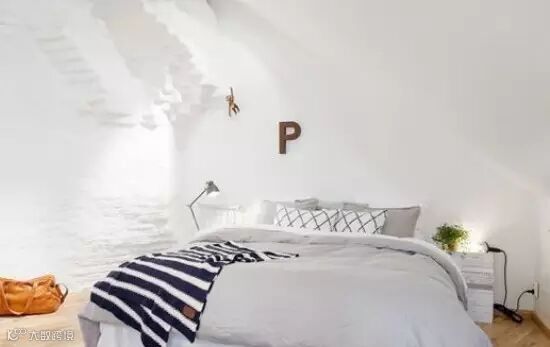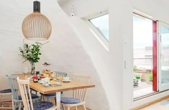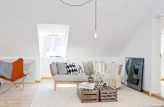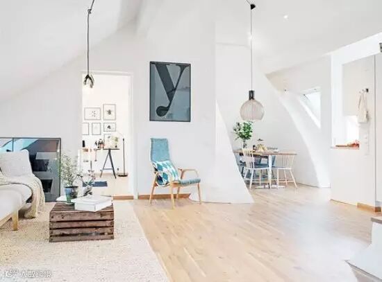 因为是阁楼,所以屋顶的高度有限,室内各个房间也都没有用门进行阻隔,而是均采用开放的样式,客厅的空间足够开阔,简单的家具点缀很好的保持着简约北欧风。白色墙面,裸色地板加上稍深点的木色踢脚线,整个空间都很自然很清新。