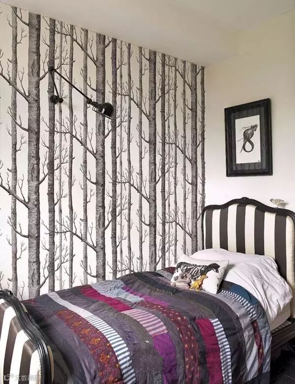 卧室被打造成森林的样子,没有绿意盎然,只有灰色的枯枝充满房间,你也许会心生萧瑟之感,但不经意间一条亮色的地毯,一个趣味十足的花纹,便又瞬间营造了春的生机。每天,在寂静的森林中醒来,然后被各种小动物包围,视觉味儿非常却又难得惬意。