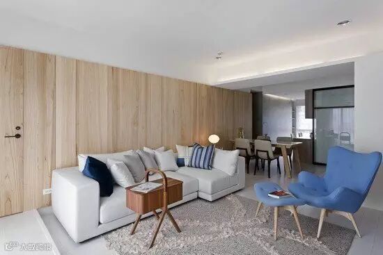 客厅大面积立面沉稳中强调了沙发背景墙,饱和的蓝色让视觉有了色彩的冲击力。白色基底、淡雅木色,让家具轻松转化为空间主角