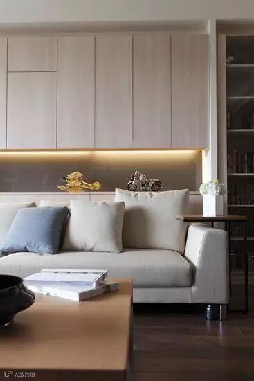 利用客厅沙发墙梁下的内凹空间规划大型柜体。加深宽度的订制沙发,或坐或卧都很舒适。