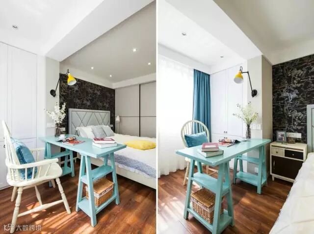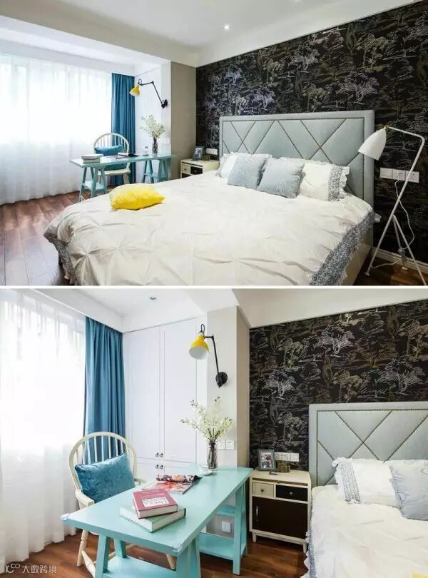 主卧,黑色暗花纹背景墙,蓝白搭配,点缀黄色壁灯,一点也不影响这个地方的清新安逸,反而觉得黑色运用的很棒。