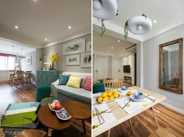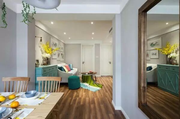 客厅,灰色暗纹沙发、搭配水蓝色斗柜、边凳,彩色抱枕,明亮清新、黄色花艺的点缀更是增添了一份愉悦的气息~