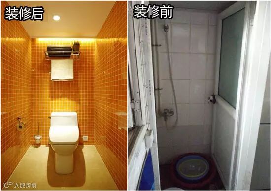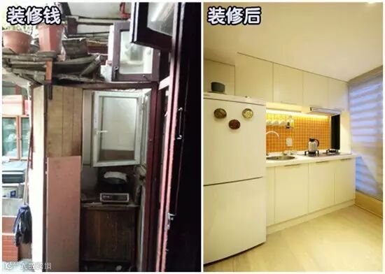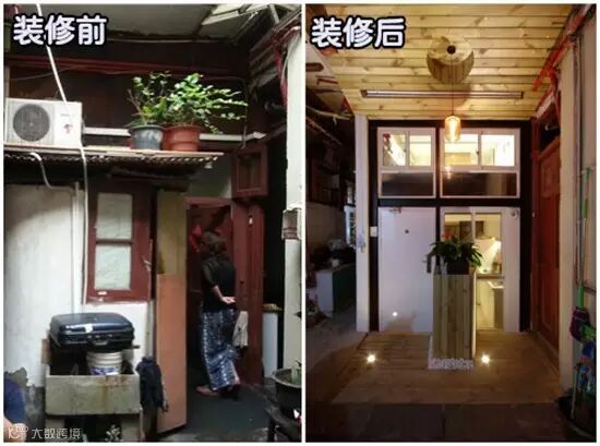 门口在重新装修后,拆除了1.6平米的违章建筑,也因此而改善了房间的采光和通风。窗户旁边的木栏用来安放洗衣机,顶上做上花盆,满足主人养花的爱好,下雨天防止水渗入到洗衣机内。顶上的吊顶灯为两家人都带来了方便。