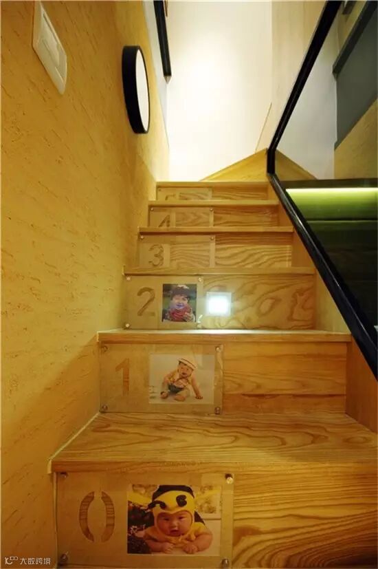 改造了原本极为陡峭危险的弧度和宽度,用小宝贝的照片将台阶打造成小宝贝的成长阶梯,在考虑实用方便的同时,13平的房子里在设计时处处都氤氲着设计师的人文情怀。