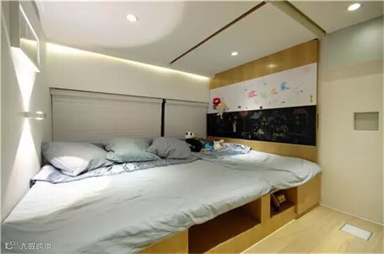 一家三口的卧室,米黄色带来家的温馨感受,在墙壁上设计了小黑板,给小宝贝作画的艺术天地。当孩子长大需要独立睡眠空间时,中间留出了隔板的夹层,将右边墙壁不再使用的黑板移到夹层里即是一面隔断墙。