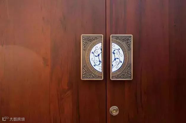 家的门是这样的。 门庭所用将军门。据说是进口东南亚柚木外包铜边。把手很有特色,内嵌青花瓷板。看上去很精致。
