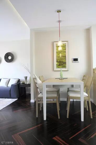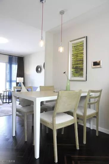 淡色系的木质餐桌使餐厅看上去干净明亮,桌上的淡绿色花瓶和插画让人心情愉悦,还有墙上相得益彰的壁画以及吊灯无一不透露着户主的品味。