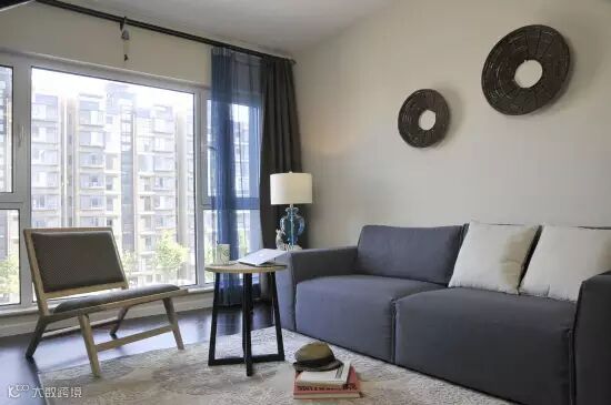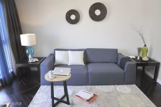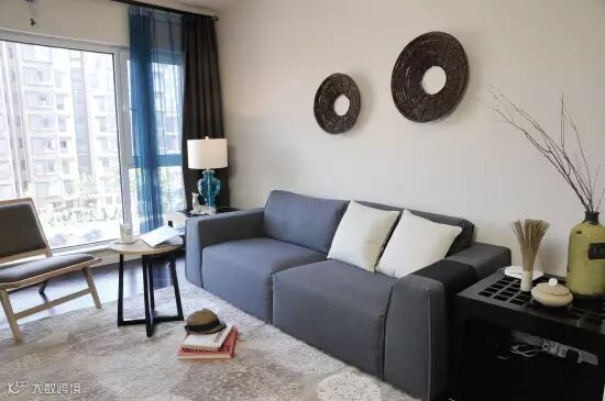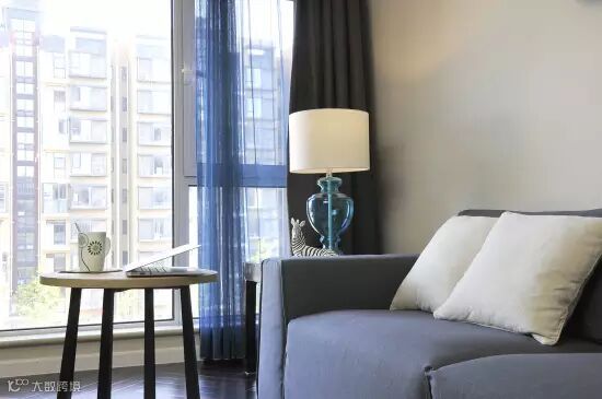 在客厅中,沙发与窗帘布艺无疑使色彩运用的绝佳之处,设计师选用了蓝色的布艺沙发,蓝色+褐色的窗帘,甚至连台灯都选用了蓝色,使得整个空间整洁干净。