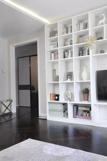 一面墙被设计师全部利用,分割成大小不一的收纳格,白色的收纳格简洁大方。看着这些收纳格有没有一点童趣的感觉,是否想到小时候逛过的格子铺。
