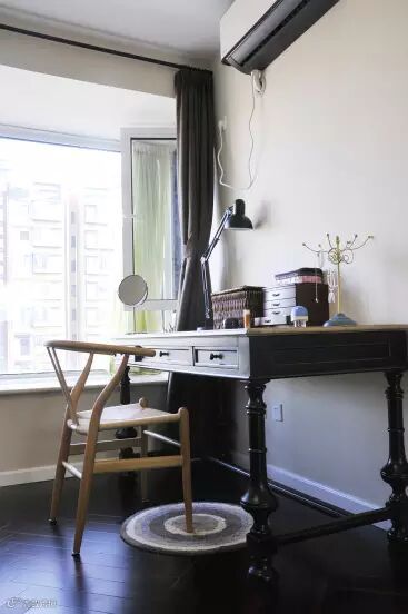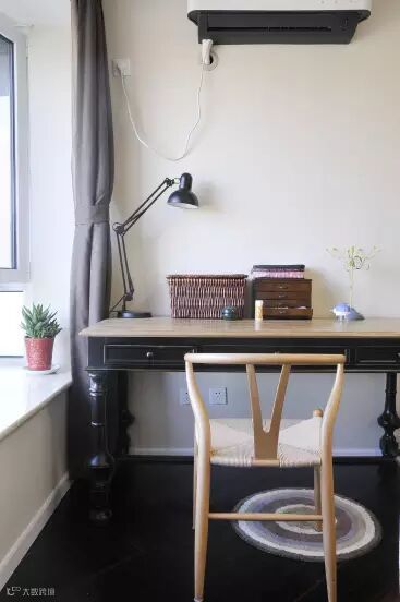 由于空间狭小,但书桌又是必不可少之物,设计师就选用了木质的小书桌,只要满足日常办公即可。