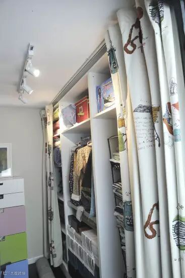在这80平米之内,储物和收纳之地,设计师可是设计了多处,以便户主收纳整理,同样是大小不一的格子为基础,再加上一块布帘,便可整齐划一。