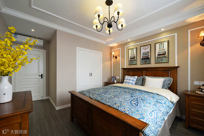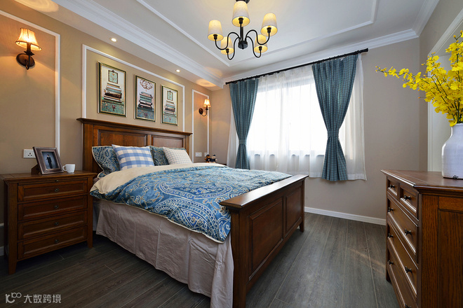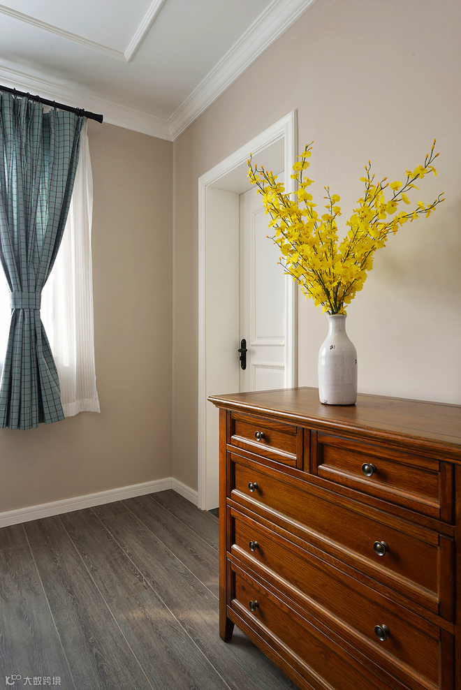 柔和晚霞黄色作卧室的主色,搭配深灰蓝条纹布艺,使卧室呈现经典温馨氛围。加以黄水仙色,玳瑁色的家居饰品点缀,使卧室空间散发细腻典雅的格调。