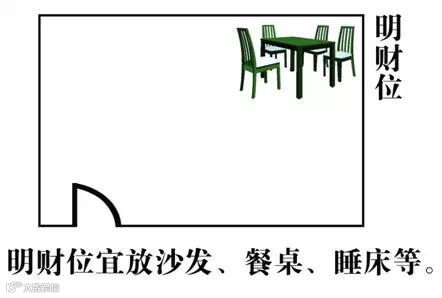 在餐厅中若把饭桌摆在"明财位"亦甚适宜,又如像对于办公室而言,将"明财位"的位置摆放老板桌或者办公桌(且办公桌要背后有靠方可),亦可催旺个人的事业运和财运的聚集。因此,"明财位"宜坐可应用于家居办公皆可。