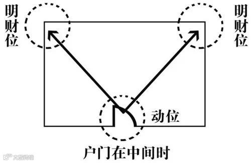 因此一个房间的财位根据户门在房间中的位置不一样,一般可分为两种:当户门在房间一角时,"明财位"在与户门对角的位置;当户门在房间某墙中间开门时,"明财位"在与户门成斜对角方向存在对称的两个"明财位"。