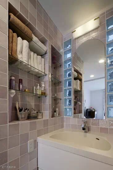 洗漱区域,灰色瓷砖搭造的墙壁,不仅耐脏,而且给空间增添了浪漫温馨的气息。女孩子的化妆品,整齐的摆放在玻璃板打造的小隔板中。塑料,木质的小篮子,增加了化妆工具的收纳性。白色、棕色的毛巾,整齐的摆放在上。圆拱形的镜子,两边采光不同的镜子,凹凸不平的造型,使整个空间更具立体感。