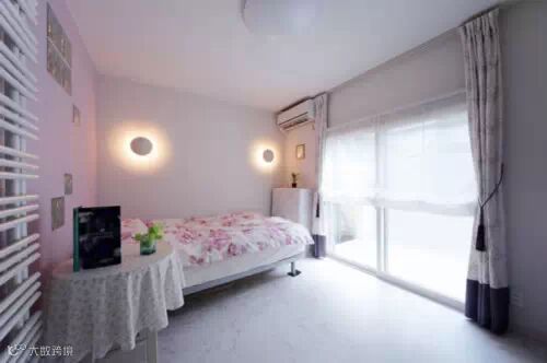 主卧色调仍以白净为主,粉橘色床头绷布,让白色安静的空间增添温暖。