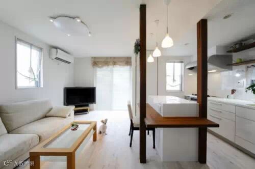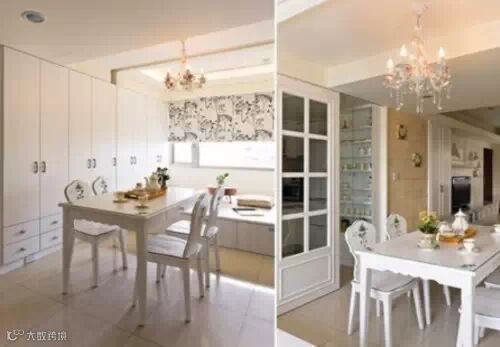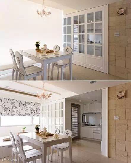 餐厅与厨房采用半开放式的轻隔间设计,厨房与餐厅间,以白色线板,装设透明拉门。餐厅与起居空间,利用天花板的高低差,设计白色拉幕,需要时可拉下,让起居空间能与客餐厅空间互相独立。