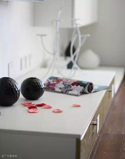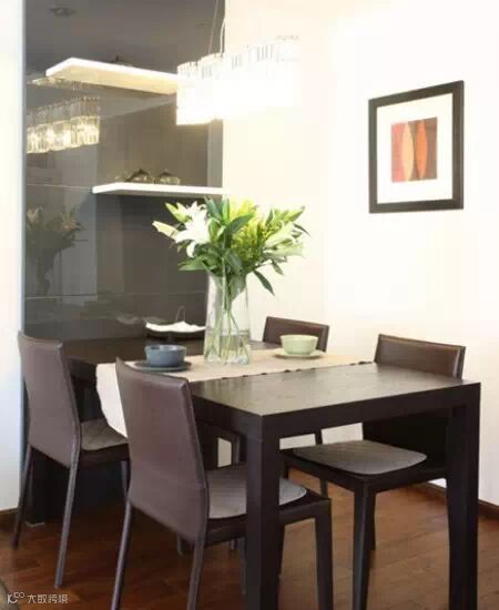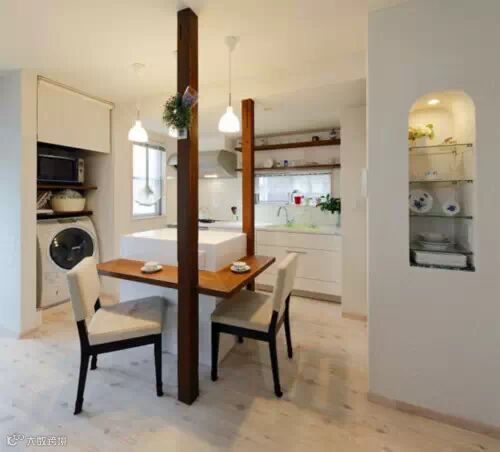 浅灰色布艺的凳子,黑色的框架,简单的色彩,搭配木色的小桌子,田园风浓郁。碗柜的两面,用木板搭造的小餐桌,独特的设计,仿佛地铁站边的速食店,淡雅生活中,感受日式风情。厨房区域,淡绿色的水池,给单一的色彩中增添了一抹亮色。墙上拱形展架,用玻璃将这个区域划分为多层。放上单眼的小花、青花瓷的餐具,清新中透出高雅气息。