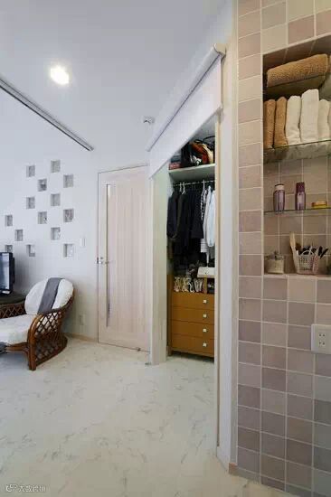 拐角区域,用一个卷帘式的白色拉帘,遮住了衣柜。上面用木板搭造的区域,很实用。竹制的藤椅,搭配纯白色的靠背垫,舒适柔软。