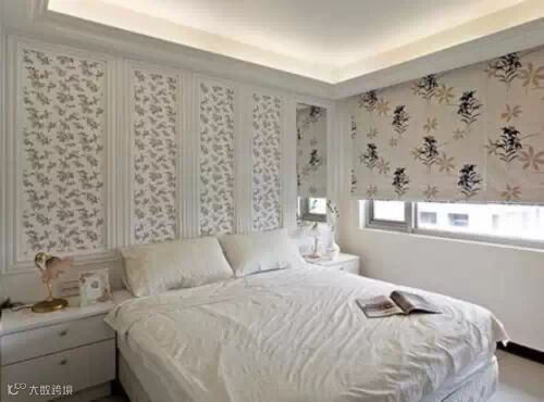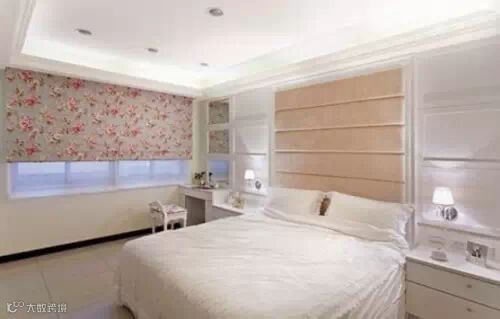 长辈房床头壁面材质为线版与壁纸、窗帘,选择较为清淡的碎花系列,让空间干净温雅。