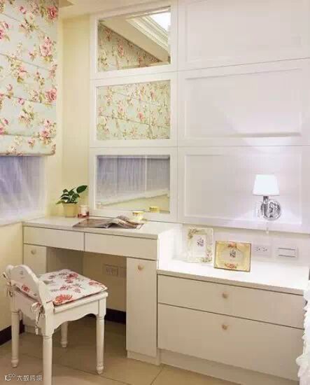 窗帘选择与玄关处同一系列的粉色碎花卷帘,与梳妆椅相搭配,梳妆镜接续床头窗格造型,让画面连贯延伸。