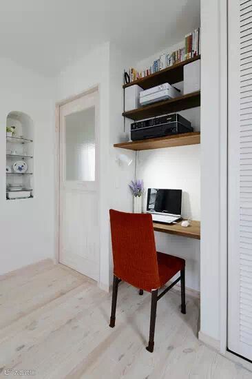 工作区域,红色的凳子,给人个性张扬的感觉。而木板打造的书架,又增添了淡雅的自然气息,两者协调统一,给工作区域增添了色彩上的享受。