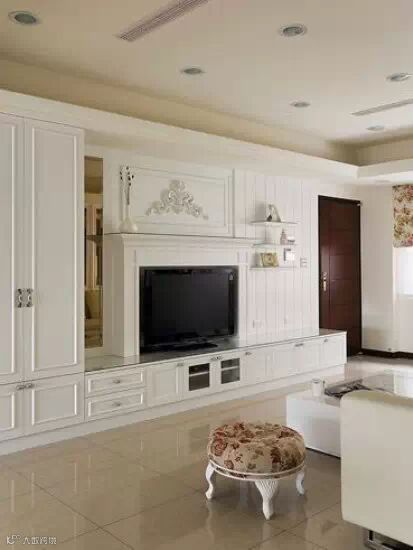 电视背墙利用夹层分割的方式,让垂直的线条呈现美式乡村平易亲切的风格,而电视的正上方,同样利用线板加上唯美浪漫的立体雕花,与沙发旁摆上的碎花小圆椅,点出梦幻视觉。