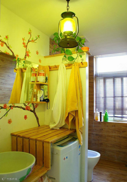 卫生间一定要用暖色调噢,这个灯和墙饰特别吧。