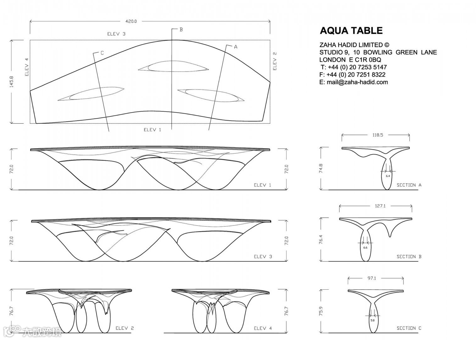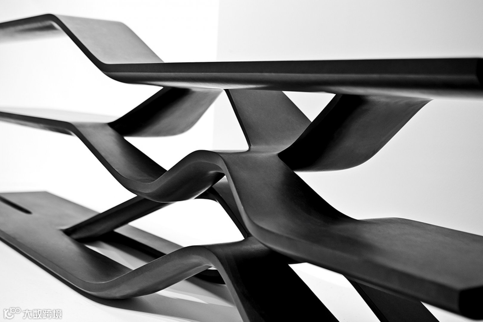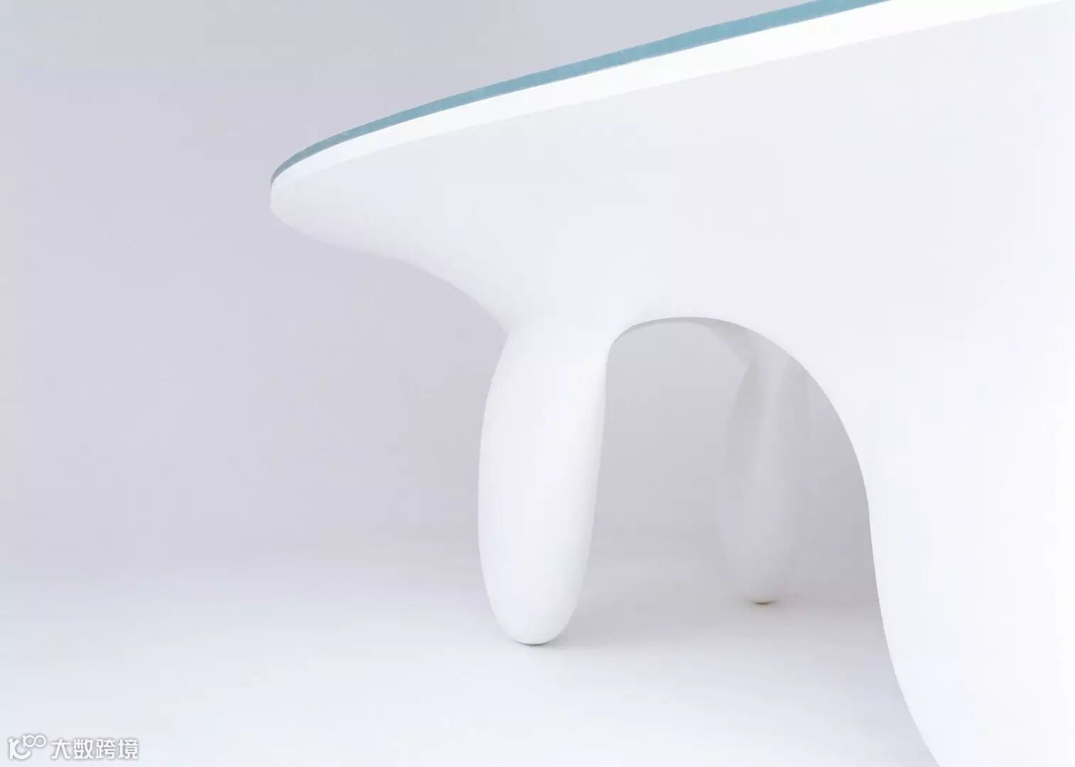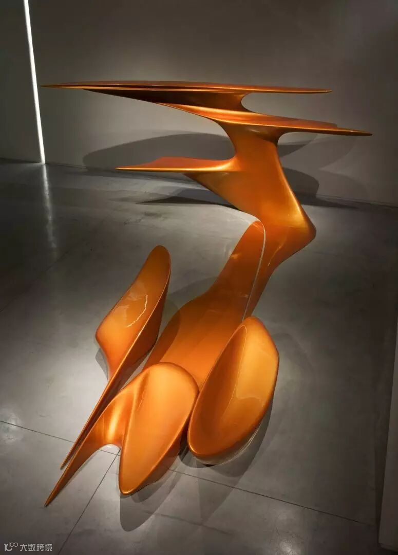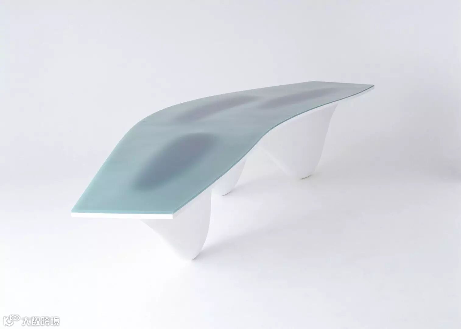Aqua 椅子描述了运动过程中未知的力作用下,自然形成了极具动态感的桌子,桌面和桌腿一体化,无边无际,桌腿正上方的桌面更像三个深渊,离奇的视觉享受把人们带入一个自然的场景中。