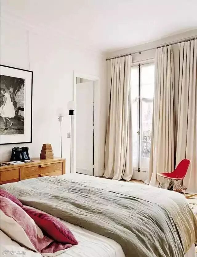 卧室以米白色为主,搭配粉色,红色及原木色,舒适宜人。附带一个阳台,使整个卧室空间的采光效果非常好,这种复杂又俏皮的设计,让这间温和的公寓弥补了它所缺乏纯粹的空间感,以其适合的方式,还原出经典的巴黎风格与现代风味的家。