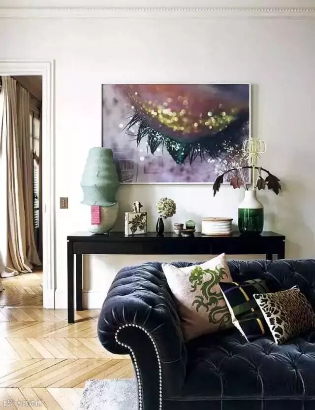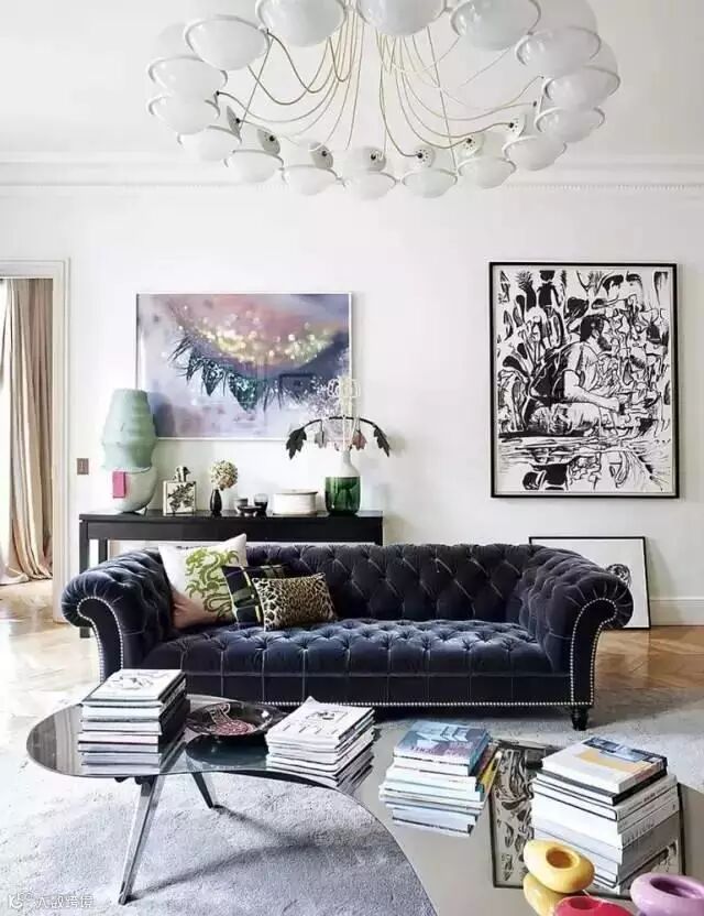 客厅以优雅的风格为主,然而深蓝色的大簇绒沙发成为其中的“搅局者”,无论是它的款式还是色调,都给人一种眼前一亮的感觉,可正是因为它的特殊性,让整个客厅变得更美好。
