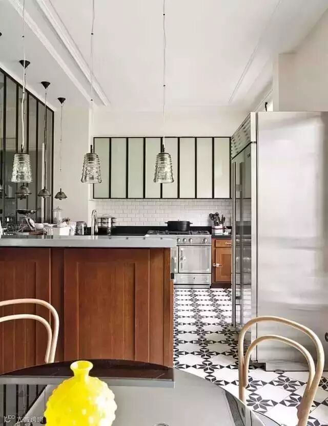 现代化开放式的厨房其功能性也是极好的,木质与金属质感的材料相互中和,厨房内的吊灯也极具设计感。厨房的地板特意选择了花砖,复古感十足。一旁的餐厅区域延续了厨房和客厅的风格,一旁的橱柜是存放美酒的好地方。