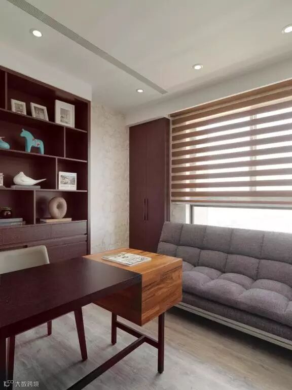 简洁线条的书房设计,选用了浅色的地板,百叶窗帘,简单式的沙发,书房非常舒服。