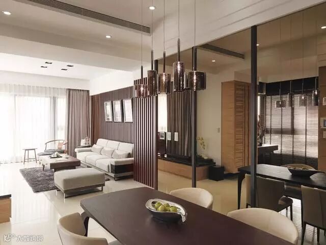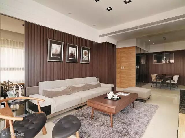 设计师通过简洁的设计,选用流畅的线条和色彩运用,体现出现代生活的审美情趣。从图中的客厅可以看出,米色的沙发和咖啡色的沙发背景墙,整体中像一杯浓郁的咖啡散发着清香的味道。餐厅咖啡色的竖条和桌子,看起来非常舒适有质感,营造出一种舒服的质感。