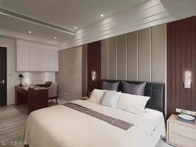 卧室延续现代风格的简约风,白色的床品非常舒服,主卧内还在进门的角落里设计了一个工作区域,这个卧室既满足了休息同时可以兼顾工作,一举两得。