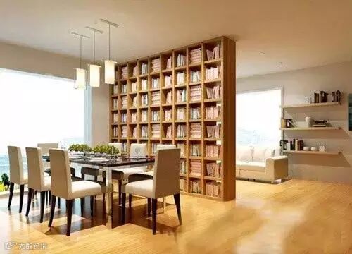 用书柜代替隔断墙,是既省空间又美观的做法,比较适合半私密空间,比如书房与过道之间、客厅与餐厅之间等。作为具有隔断功能的书柜墙,这种书柜需要摆放相对整齐的书籍和装饰物,不能太过随意,否则就会使空间显得凌乱。