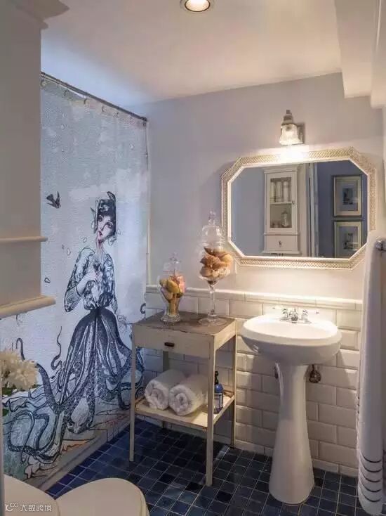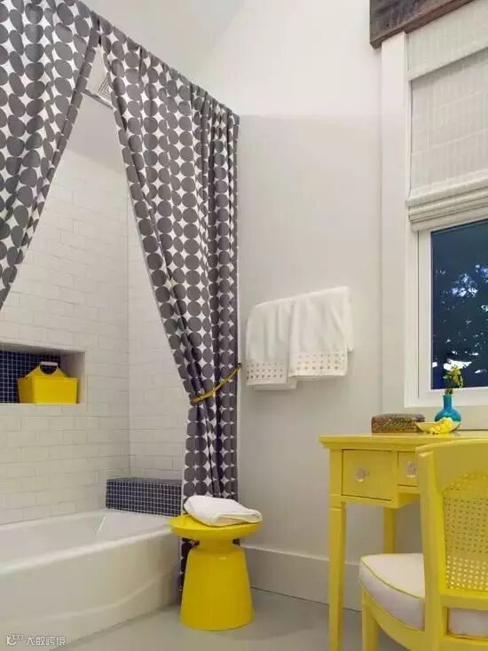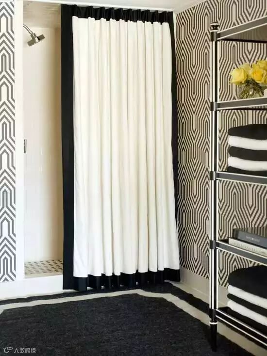 除了玻璃可以用作干湿分离,各式花样的浴帘也很棒,还可以通过更换浴帘塑造不同的空间感