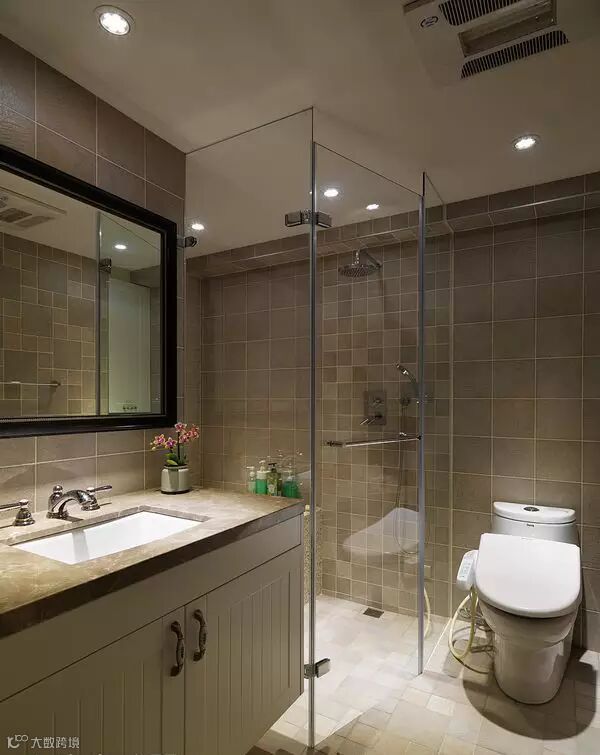 ▲卫生间1,玻璃隔的淋浴房,并用花砖进行分区,整体设计干净利落