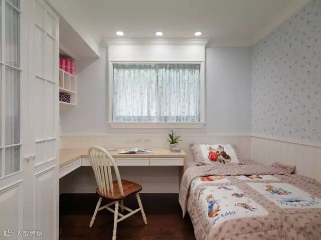 ▲女儿房2,壁纸和软装打造清新淑女气质,工作区、收纳柜和衣橱设计将空间利用充分